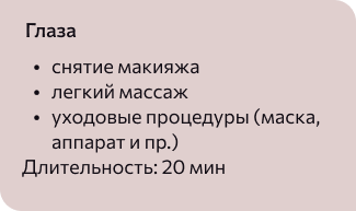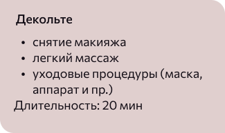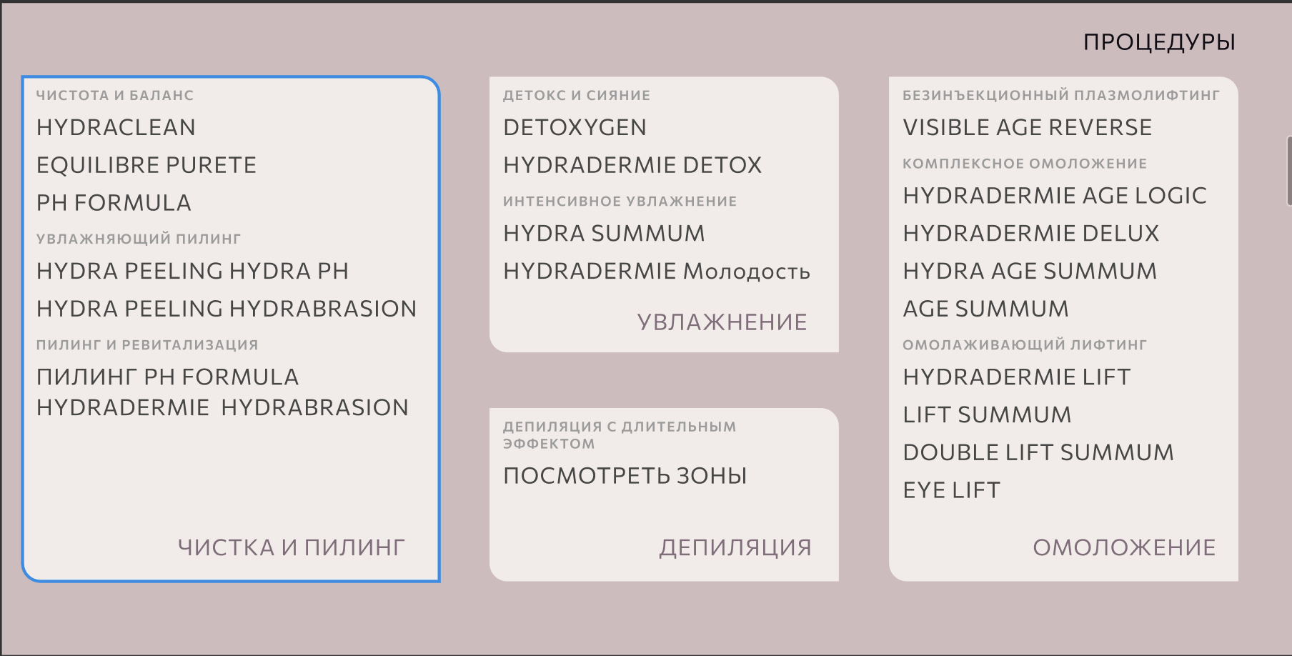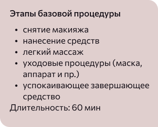 Мы объединили основные этапы и создали универсальную стартовую конфигурацию. Конструктор позволяет увидеть, что входит в процедуру, ее длительность и стоимость. Вы так же можете выбрать дополнительную зону внимания, а специфику воздействия определить с врачом, по итогу консультации.